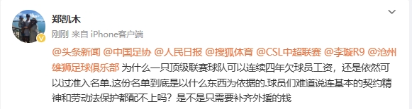 鄭凱木:“為什么一只頂級聯(lián)賽球隊可以連續(xù)四年欠球員工資,還是依然可以過準(zhǔn)入名單。這份名單到底是以什么東西為依據(jù)的?球員們難道說連基本的契約精神和勞動法保護(hù)都配不上嗎?是不是只需要補(bǔ)齊外援的錢?”